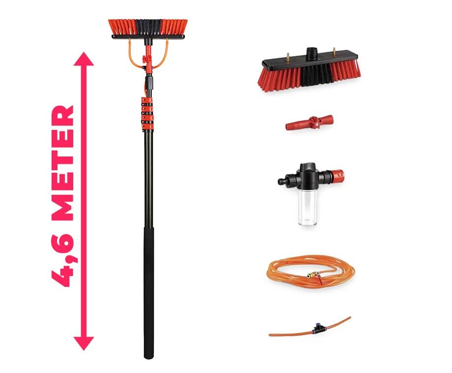 Met deze telescopische waterborstel worden alle schoonmaakklusjes buitenshuis een stuk makkelijker! Dankzij de robuuste borstelharen én de ingebouwde waterborstel reinig je snel en eenvoudig diverse oppervlaktes. Robuuste borstelharenSchoonmaken op hoogte was nog nooit zo makkelijk geweest. Deze uitschuifbare waterborstel bestaat uit 4 delen die je maximaal tot 4,6M kan schuiven. Heb je groene aanslag op…