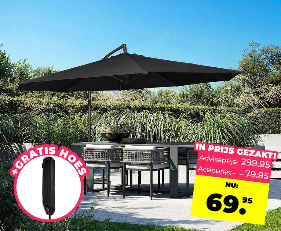 Informatie Zweefparasol Incl. GRATIS Hoes t.w.v 19,95 Met een diameter van 3 meter zorgt deze luxe SEVVA® zweefparasol voor een flinke schaduwplek in de tuin of op het balkon. Dankzij het slimme ontwerp zit het metalen frame aan de zijkant, zodat er geen staander in de weg staat. Zo blijft de ruimte onder de parasol…