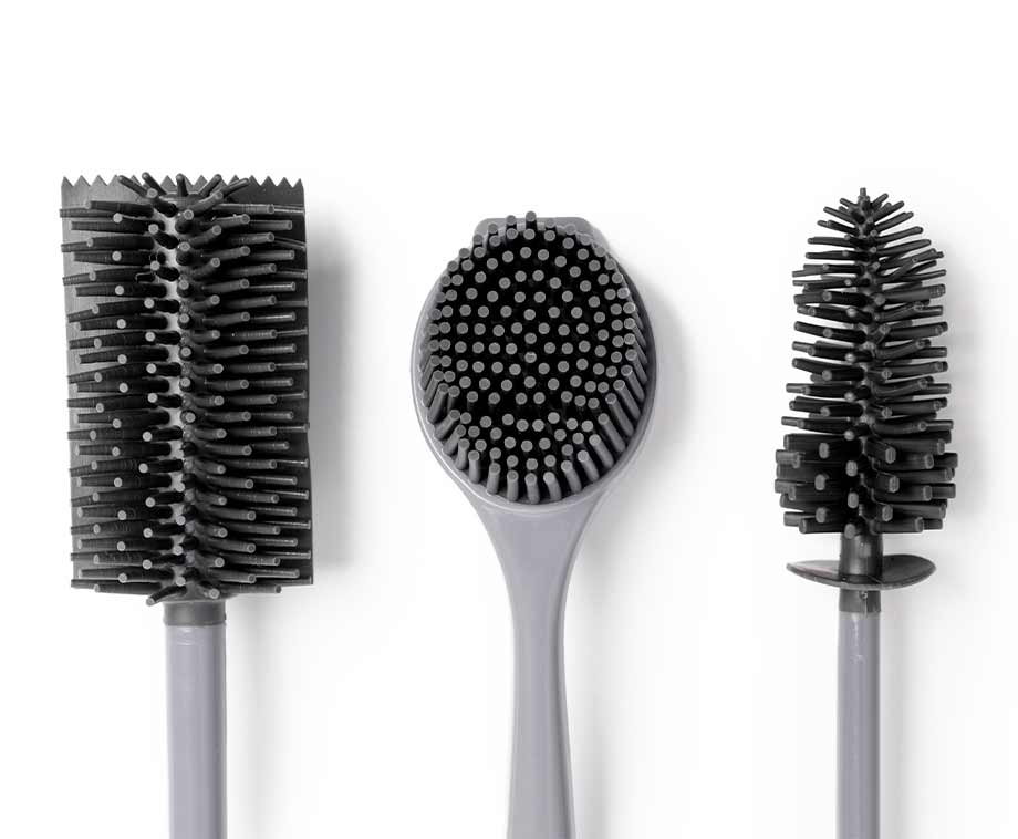 De keukenborstel voor bijzonder grondige reiniging door flexibele en hygiënische siliconen borstels. Dankzij de ergonomische handgreep ligt de borstel goed in de hand en garandeert hij een lange houdbaarheid. Je kunt de flessenreiniger gebruiken voor sodastream- en babyflessen, de reinigingsborstel voor potten en pannen en de flexibele borstel voor de lastigste plekjes kleine opening en hoekjes. Om een maximale hygiëne te bieden zijn de reinigingsborstels tot 65 °C vaatwasmachinebestendig. Daarnaast gaan deze borstel veel langer mee dan standaard afwasborstels!