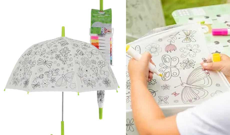 Regenachtige dagen saai? Echt niet! Met deze vrolijke inkleurparaplu wordt buiten spelen juist extra leuk. Kinderen kunnen de mooie vlinders op de paraplu zelf inkleuren en zo hun eigen unieke creatie maken.