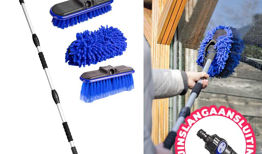 Met een maximale lengte van ongeveer 142 cm biedt de telescopische steel genoeg reikwijdte om zelfs de hoogste oppervlakken te bereiken. Dankzij de universele aansluiting sluit je de wasborstel eenvoudig aan op je tuinslang, zodat je meteen aan de slag kunt. De set komt met drie verschillende borstels: een borstel met zachte haren van 6 cm, een borstel met ruwe haren van 3 cm en een chenille mop. Zo kun je elk oppervlak grondig reinigen, van delicate autolak tot hardnekkig vuil op terrassen.