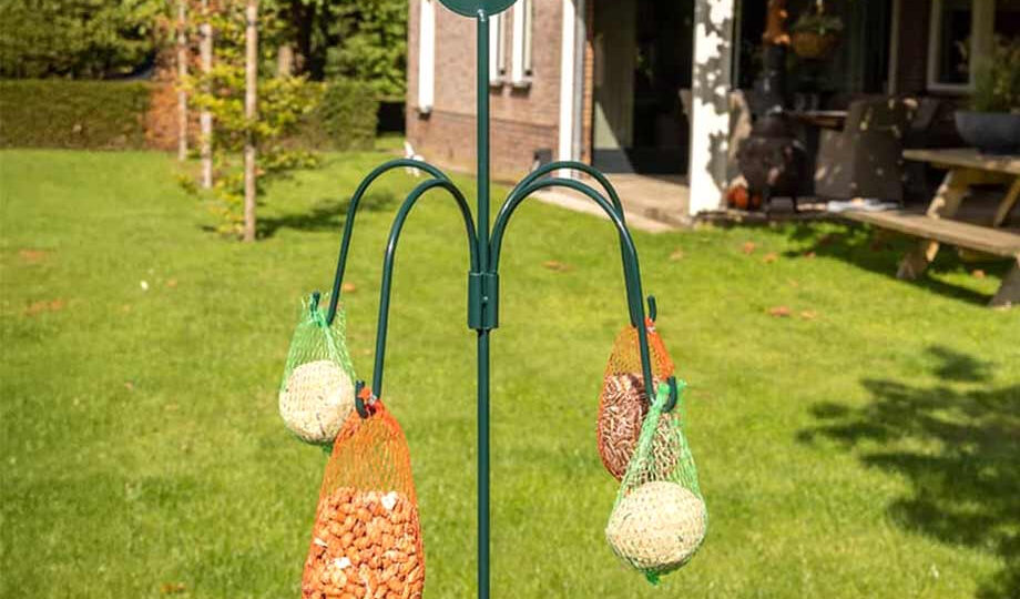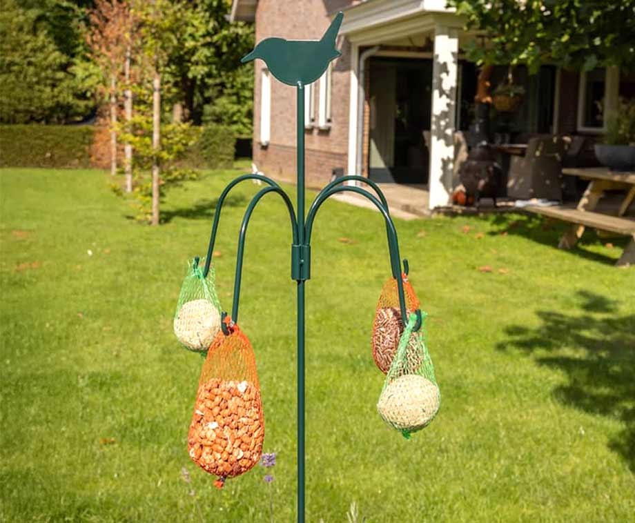 Slim en praktischDe standaard bestaat uit twee delen die je eenvoudig in elkaar zet. Daarna steek je hem in de grond en hang je er voedersilo’s, vetbollen of andere lekkernijen aan. Zo blijft alles netjes en overzichtelijk op één plek.